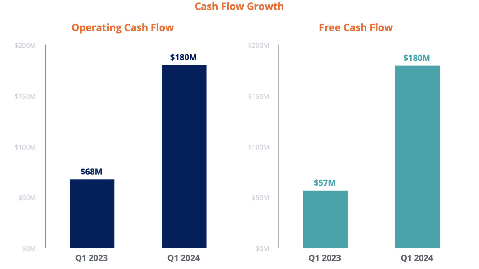 - Cash flow from operations and free cash flow both reach $180 million