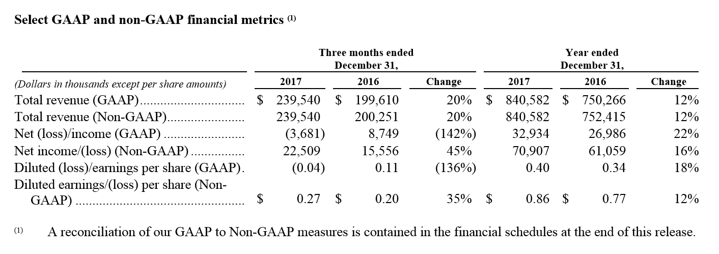 - 2018 Guidance (under ASC 606): GAAP Revenue of $950 million, GAAP EPS of $0.53, and Non-GAAP EPS of $1.20.