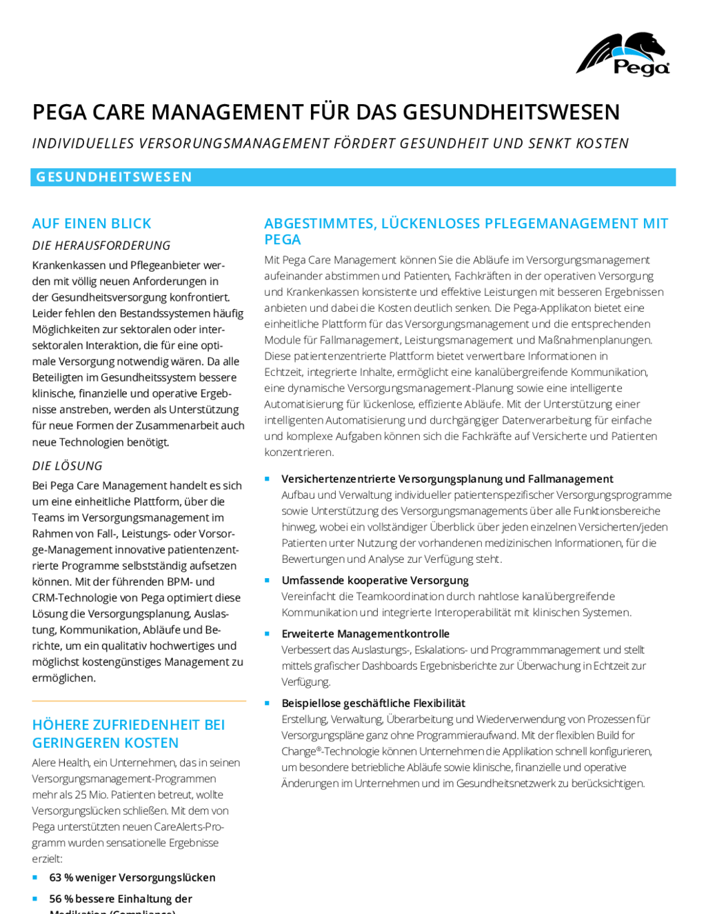 Bei Pega Care Management handelt es sich um eine einheitliche Plattform, über die Teams im Versorgungsmanagement im Rahmen von Fall-, Leistungs- oder Vorsorge- Management innovative patientenzentrierte Programme selbstständig aufsetzen können. Mit der führenden BPM- und CRM-Technologie von Pega optimiert diese Lösung die Versorgungsplanung, Auslastung, Kommunikation, Abläufe und Berichte, um ein qualitativ hochwertiges und möglichst kostengünstiges Management zu ermöglichen.