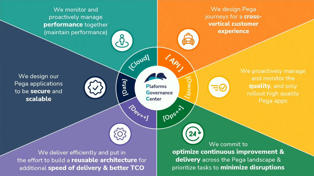 - Yeah, I'm gonna tie it back to what I was talking about earlier, which is our DNA is, we are a tech organization, we like to experiment, we like to build things in-house. We have our core tech guiding principles as an organization. And going through that cultural change with bringing Pega in, we had to try align our guiding principles with what we already had so that we could get buy-in. And that was a a little bit of a, well, it wasn't a struggle, it was a challenge for us, but it gave us the opportunity to see some synergies and actually be able to sell and position what we were doing, the direction we were going in. Now I think it's a gradual process, right? We're still learning, we're still coming up against challenges, and I'm not naive enough to think that we are not going to come up against a lot more. Once we look at integrating other areas of business, for example, FinTech, we're gonna be talking about capabilities we haven't actually enabled yet. Right now we are live in accommodation for 5,000 agents. At the moment, only one channel. We are going to multi-channel, and that is one of our simpler business areas. So I know that there's going to be a lot more complexity coming, and having these guiding principles and having that synergy with what we already have existing in our business helps us through that process. And I mean some of them are very simple in terms of quality, right? We wanna make sure that we're building to last and we are not finding out about things too late and extending that timeline unnecessarily. Something that's forefront of a lot of people's minds as well at the moment is security, risk, ransomware. So for us it's really important to do a lot of stress testing, a lot of performance monitoring as well. And so we've put, again, these areas in place with the center of excellence so that we can continue to monitor, govern, learn, reuse, measure, and move forward.