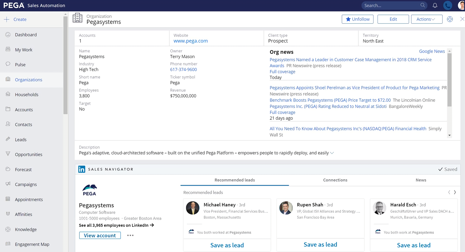 Die Unternehmens- und Kontaktdaten aus LinkedIn Sales Navigator können in Pega Sales Automation abgerufen werden