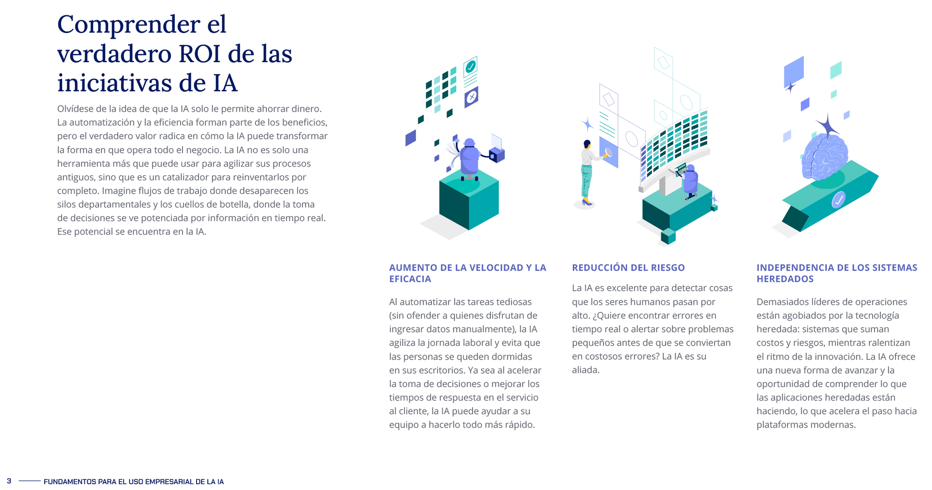 Independientemente de que busque reducir ineficiencias, mejorar la toma de decisiones o eliminar sistemas heredados, esta guía proporciona la información necesaria para promover la adopción de la IA en su organización.