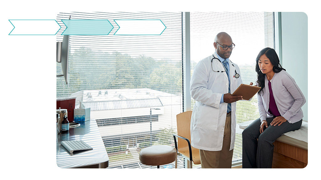 Stylized image of a healthcare worker interacting with a patient Stylized image of a doctor reviewing information with a patient and their relative