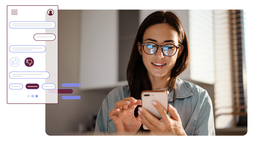 Stylized image of a woman looking at information on their phone Stylized image of a man reviewing information