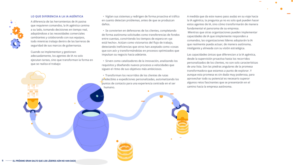Basado en las opiniones de 180 responsables de la toma de decisiones empresariales en las funciones de atención al cliente, operaciones y TI, este informe exclusivo proporciona la hoja de ruta práctica para aprovechar la IA agéntica en toda su empresa y transformar los procedimientos estáticos en experiencias dinámicas y autooptimizables que se anticipan a las necesidades antes de que surjan.