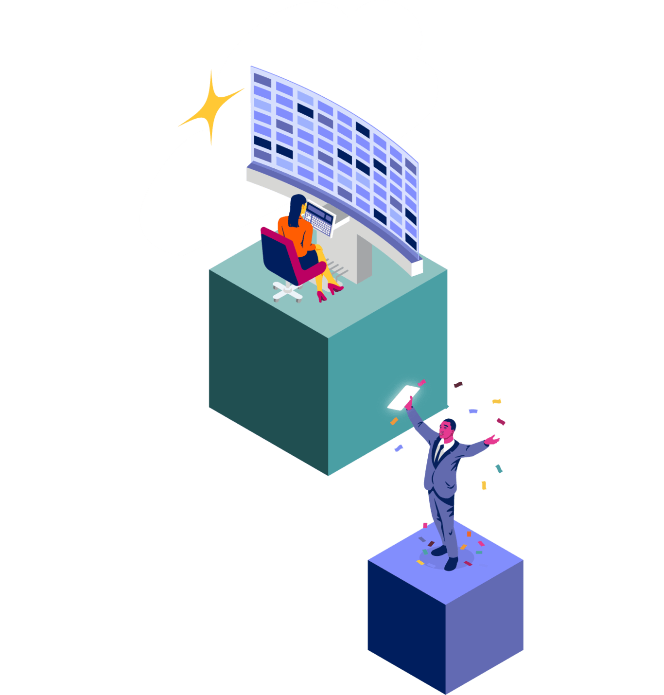 Stylized illustration of people at a conference standing on orange and navy floating blocks