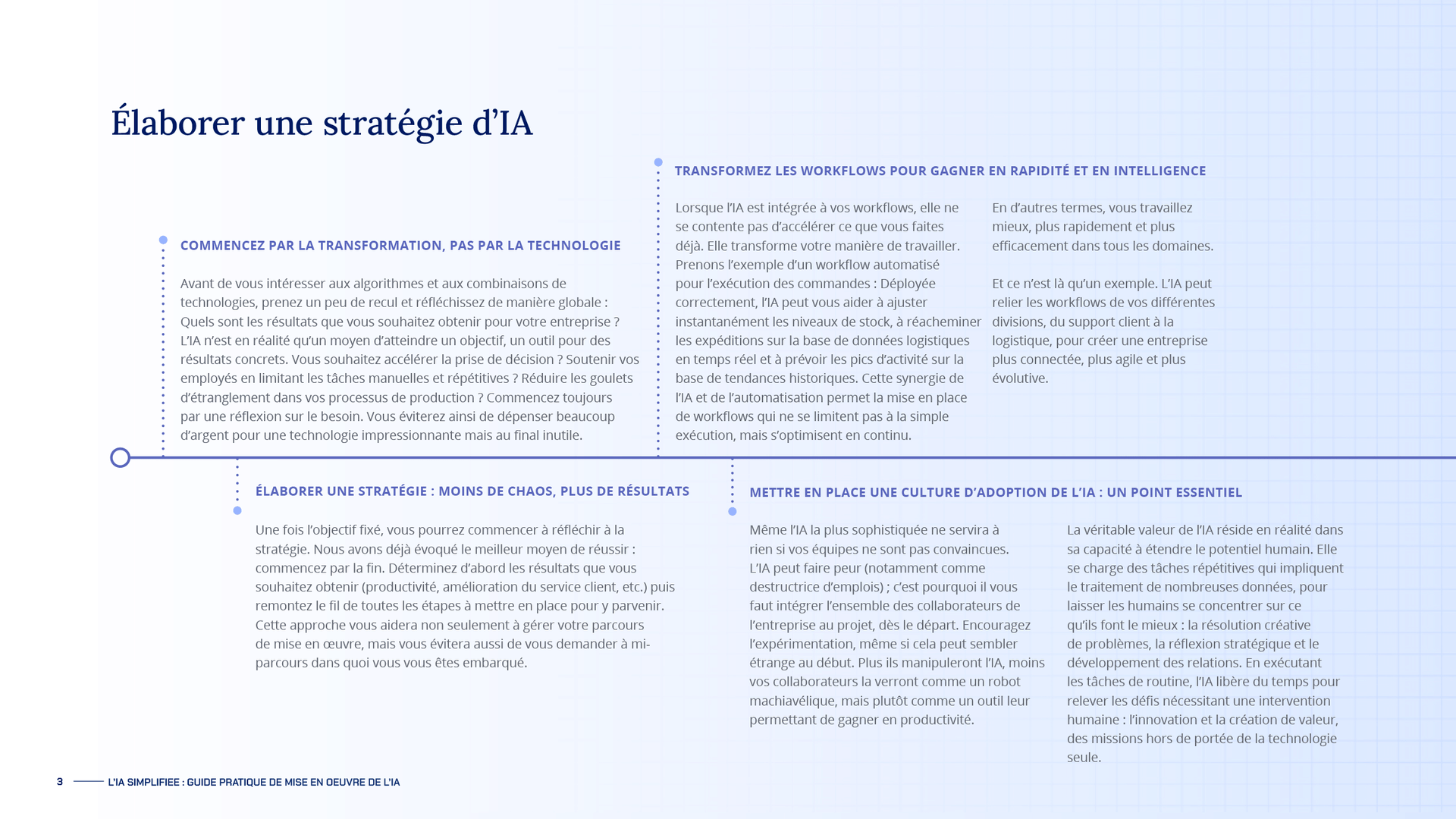 Ce guide explique comment aborder la mise en œuvre de l’IA de manière stratégique, surmonter les obstacles les plus courants et maintenir votre entreprise sur la voie de la transformation. Autrement dit, tout ce dont vous aurez besoin pour faire de l’IA une réalité, et non plus une simple idée.
