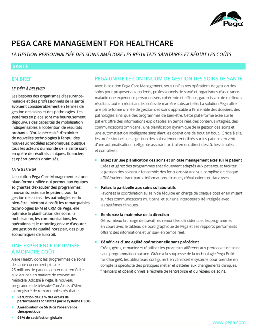 La solution Pega Care Management est une plate-forme unifiée qui permet aux équipes soignantes d’exécuter des programmes innovants, axés sur le patient, pour la gestion des soins, des pathologies et du bien-être. Mettant à profit les remarquables technologies BPM et CRM de Pega, elle optimise la planification des soins, la mobilisation, les communications, les opérations et le reporting en vue d’assurer une gestion de qualité hors pair, des plus économiques de surcroît.