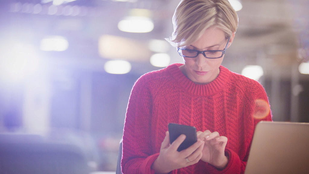 Photo of a person holding a cellphone with an illustration of a case management flow chart above