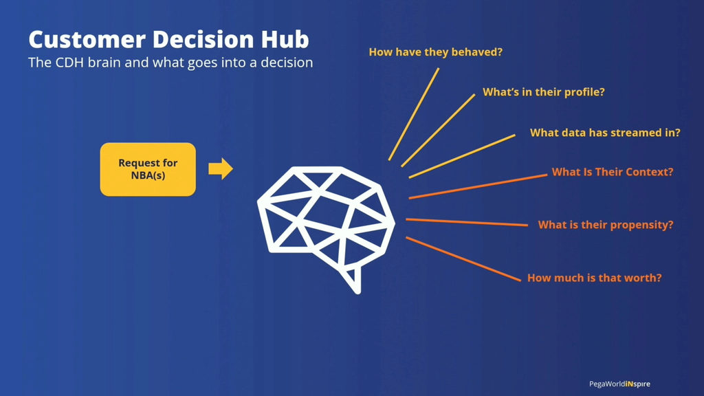 Well, thanks for that. I mean, and I think that's just another good example of how Pega we like to use that phrase of minimum lovable product, but starting with a small use case and then expanding the integrations and the channels you move into, building out your business operations and expanding that further, and then just putting more actions and treatments into what you've built. That's a pretty standard approach, and I'm glad that's working. So before we get into the topic today, we just thought we'd take a few minutes to dive into Customer Decision Hub just really quickly, depending on a broad range of people in the room. So anyone that's talked to Pega at some point will have heard of Pega as a Customer Decision Hub as the brain. And it really all just starts with that request coming into Customer Decision Hub for the next best actions. So whether it's the website looking for three actions or CDH itself processing all the outbound customers, looking for the next customer and what the next best action would be. So first thing we need to do is load that data into memory. And here it's really sort of historical data, near-time data and real time data.