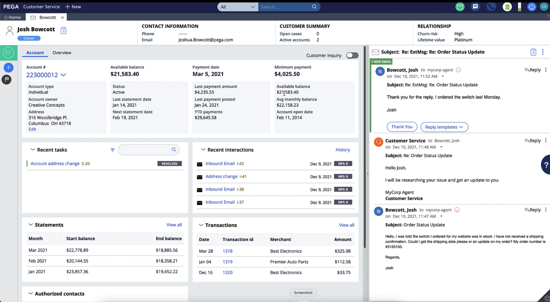 Whether it’s changing an address, requesting a new card, or checking on a payment, Pega Email Bot uses powerful case management to create and triage work to the right person or system, and drive it to completion.