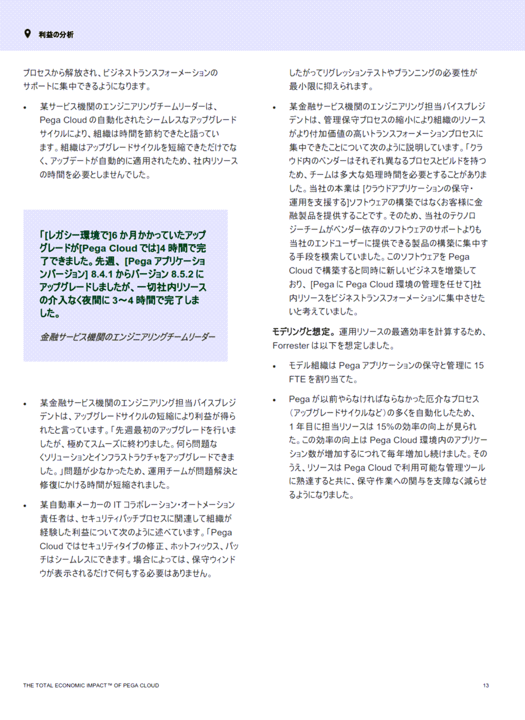 "After the investment in Pega Customer Decision Hub, the interviewees unified their marketing, sales, and services messaging across channels and interactions with customers. Key results from their investments included an increase in incremental profits from next best experience, reduced customer churn, contact center and business user efficiencies, and cost savings from retiring personalization engine tools."
